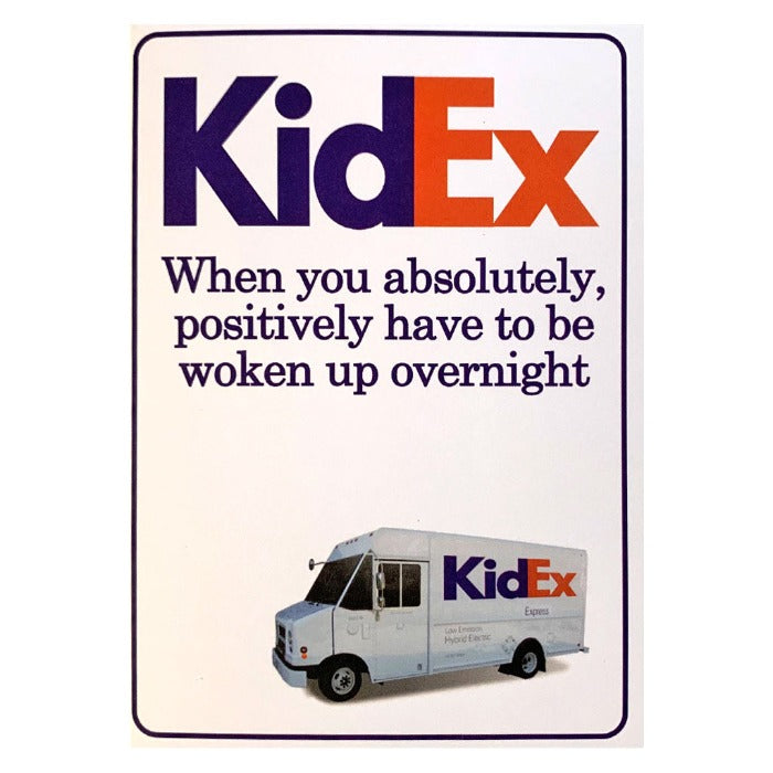 Use KidEx when their mum or dad absolutely positively, have to be woken up overnight. Fun greeting card for a new arrival or a baby that was a late delivery ;)