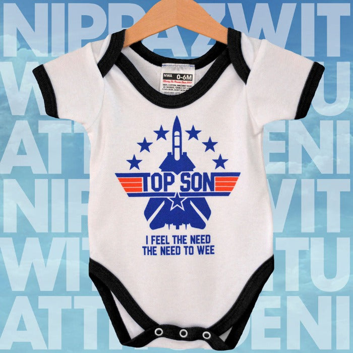 My must-have Top Gun themed baby grow. Fun gift for any budding impulsive jet pilot ace. I feel the need...the need to wee!! *High fives Maverick on way to toilet...*